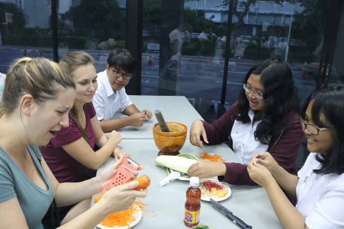 On 28 August, 4 September and 17 October, a Thai Classes offer basic and essential Thai words and phrases to exchange students. They could use the learning material to use it in their daily life in Bangkok or on their vacation. During the class, we have lots of teaching techniques and activities to make it not only easy,but also fun for them to learn Thai. Moreover, this year we provided them with an opportunity to make their own “Som Tum” ,which is our nation authentic dish. Furthermore, these class give a chances to both international and thai program student to be a “buddy” with exchanges and initiate a friendship along with foster a language development.